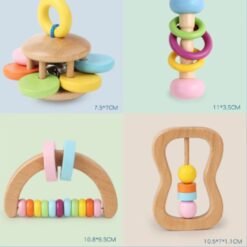 Wooden Baby Rattle Set হলো ০–১২ মাস বয়সী শিশুদের জন্য একটি নিরাপদ, সুন্দর এবং Montessori-অনুপ্রাণিত শেখার খেলনা। এই সেটে রয়েছে নানা ডিজাইনের র্যাটল, টিথার ও ব্রেসলেট-টাইপ খেলনা, যেগুলো শিশুর হাতে সহজে ধরা যায় এবং খেলতে খেলতে তাদের ফাইন মোটর স্কিল, স্পর্শ অনুভূতি ও শ্রবণশক্তি উন্নত করে।